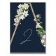 Une belle pyramide de bois rustique de style bohème avec des flancs d'aquarelle blancs en cascade sur le côté et un arrière - plan bleu. Un design unique qui utilise des plantes vintages d'aquarelle blanche sur une structure triangulaire bohème. Un charmant design floral blanc aux caractéristiques rustiques et géométriques et à l'élégante typographie de script. Un design élégant de numéro de table de mariage avec des éléments modernes. Des invitations de mariage et d'autres articles de papeterie sont également disponibles. Customisez le numéro et achetez chaque numéro de table individuellement en fonction du nombre de numéros de table dont vous avez besoin.