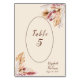 Belles fleurs séchées, pampas herbe, frondes de palmiers, blé, feuilles séchés et baies carte numéro de table.