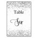 Le numéro de table est écrit avec un élégant script de style écrit à la main. Des lettres noires, un arrière - plan blanc à l'avant et un arrière - plan faux argent avec de la poussière de parties scintillant, brillent à l'arrière.