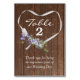 Coeur de ruban blanc avec arc, fleurs violettes et lierre vert sur bois de grange brun rustique pour le numéro de table. Tout le texte peut être modifié.