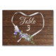 Cœur de ruban blanc avec bouquet floral violet et lierre sur une table en bois de grange rustique marron numérotée.