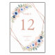Numéro de table de mariage moderne - carte, floral et géométrique. Dans les tons rose doré, pêche et bleu.