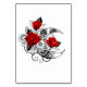 Contour, lune de croissant mécanique avec des engrenages, décoré de roses rouges avec des tiges noires spirées et feuilles sur arrière - plan blanc. Steampunk