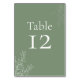 This dark sage green table number features soft ivory typography and refined botanical line art for a modern, elegant look. Created to match the dark sage wedding invitation and menu, this design is part of the sage monochrome collection. Perfect for evening, woodland, garden, boho, and modern receptions, adding a stylish accent to your table settings.