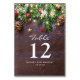 Cartes de numéro de table de fête de Noël hivernal rustique avec un fond en bois sombre, des branches d'arbre de Noël festives, des décorations d'arbre rouges et dorées et des guirlandes lumineuses.