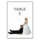 Épouse traînant le marié par son collier sur blanc pour le numéro de table de l'humour mariage.