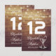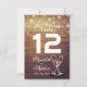 Modèles de place de mariage / numéro de table / carte d'accompagnement - Écriture élégante, verres à champagne vintage et guirlandes lumineuses sur fond en bois rustique.