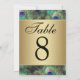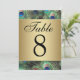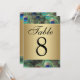 Cartes numéros de table. Fond de plume de paon élégant et raffiné dans des couleurs saturées et riches de bleu royal, d'or cuivré et de vert émeraude. Le paon est un oiseau majestueux avec des plumes ornementales et fait une belle exposition pour un mariage estival ou toute autre occasion. Les dégradés dorés métalliques ajoutent une touche de glamour et de raffinement.