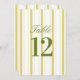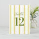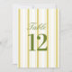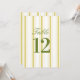 Un numéro de table de mariage rayé jaune et vert présentant une mise en page élégante et épurée ainsi qu'une palette fraîche et stimulante. Les douces rayures verticales ajoutent une touche classique et intemporelle tout en gardant l'apparence moderne et élégante pour toute réception. Parfait pour les mariages de printemps, d'été, de jardin ou de destination, ce numéro de table apporte une finition coordonnée et soignée à votre décoration de célébration.