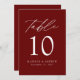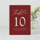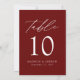 Cartes de numéro de table mariage tendance et minimaliste avec lettrage moderne blanc avec "Table" dans script de calligraphie moderne. Le design est composé d'un arrière - plan bordeaux ou d'une couleur de votre choix. Le dessin se répète à l'arrière. Pour commander les cartes de table bordeaux : ajoutez votre nom, votre date de mariage et votre numéro de table. Ajoutez chaque numéro à votre panier individuellement et retirez-le lorsque vous avez terminé.