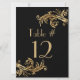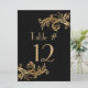 Ajoutez une touche élégante à vos tables de réception de mariage avec ces grandes cartes de numéro de table design faites en noir jet, avec des fioritures dorées, sur le dessus et le bas de la carte. Personnalisez le texte doré pour chaque table à votre réception.