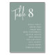 Des cartes numériques simples et chic dans Eucalyptus Green et white font une déclaration élégante à votre mariage ou événement. Le design comporte "table [nombre]" en écriture manuscrite, avec les noms d'invités individuels ci-dessous dans la typographie serif intemporelle. Le design se répète de part et d'autre.