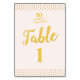 Assistez à vos invités avec élégance avec cette carte de numéro de table 50th Mariage Anniversaire Rose-Bleu. Des points en or faux bordent le haut et le bas, et un arrière - plan rose pâle apporte une touche douce. Le lettrage ressemble à du papier doré. Design ©Vann-Horn Créative Photo & Designs.