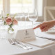 Make your wedding reception shine with these elegant place cards featuring a delicate chandelier illustration adorned with a charming rose bow. The beautiful script font displaying the guest's name adds a touch of sophistication to each setting. These cards are perfect for creating a memorable and personalized experience for your guests, ensuring they feel welcomed and cherished. Let this exquisite design set the tone for a romantic and unforgettable celebration. The minimalist design on a clean white background allows the intricate details of the chandelier and hand written text to stand out beautifully.