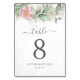 Beaux numéros de table mariage avec des eucalyptus couleur rose florale et des feuilles or.