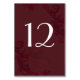 Elégante carte de numéro de table de réception de mariage faite en bordeaux foncé, avec des graphiques de fleurs bordeaux. Personnalisez le texte blanc en gras pour chaque table à votre réception. Produits mariages correspondants disponibles.