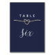 Numéro de table bleu marine simple, minimaliste et élégant avec coeur de corde or et script de calligraphie moderne.