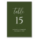Élégant Script moderne Olive Green Mariage Numéro de table. Ce design minimaliste élégant comporte un numéro de table écrit audacieusement, les noms de mariée et de mariée et la date du mariage sur arrière - plan vert olive. Personnalisez-le avec vos informations. Affichez la collection correspondante.
