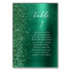 Le bord gauche de cette élégante carte de numéro de table mariage moderne comporte une bordure en faux parties scintillant vert émeraude. Le mot "table" et le numéro de table apparaissent en écriture blanche sur un arrière - plan en métal brossé vert émeraude. Ajoutez les noms de vos invités qui sont affectés à chaque table.