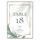 Carte de numéro de table de mariage | Feuilles vertes tropicales élégantes modernes entourant ce cadre doré - Le verso est d'une couleur coordonnée complémentaire. Personnalisez le texte, le style de police, la couleur et la taille. Œuvre originale créée pour le BarefootBride™ par © WhimsicalArtwork™ - Cela fait partie d'une suite complète de papeterie de mariage avec papeterie de mariage, de baby shower et d'autres événements assortis.