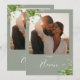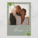 Ces numéros de table de mariage floral de verdure botanique élégants peuvent être personnalisés avec votre photo et vos numéros de table en typographie chic sur un fond de sauge vert. Les cartes sont imprimées au recto et au verso (recto-verso). Conçu par Thisisnotme©