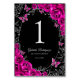 Fuchsia pink black silver Quinceanera celebration table number cards. Features, script font, glitter silver butterflies, watercolor roses and tiara. Perfect for an elegant princess style glam celebration. Personalize with your own details. Printed Zazzle invitations or instant download digital printable template.