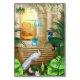 Paysage d'imaginaire royal blanc et bleu-vert dans un temple tropical entouré de verdure et décoré de bijoux en plumes d'or moderne. Palette de couleur d'or, blanc & vert avec élégamment tourbillonné design graphique brillant cérulean bleu plumes paon or et fleurs blanches.