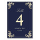 Elégante carte de numéro de table baroque bleu marine et or, parfaite pour guider les clients vers leur siège à la réception. Conçu avec des fleurs dorées ornées et des détails personnalisables, ce numéro de table est idéal pour les mariages classiques, de luxe et classiques. Coordonné avec la suite de faire-part de mariage baroques bleu marine et or pour un look cohésif.