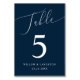 Numéro de table de mariage minimal et élégant avec texte de script moderne qui dit "Table" en haut sur un arrière - plan bleu marine.