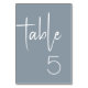 Les numéros de table modernes rehaussent le décor de votre table d'accueil de mariage. Le design comprend une police de script élégante en blanc sur un arrière - plan bleu poussiéreux, parfait pour un mariage de automne ou un banquet. Commandez chaque numéro de table dans la collection ou modifiez cette carte pour chaque numéro nécessaire. Le dessin est imprimé sur les deux côtés.