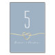 Simple, minimaliste, moderne, élégant numéro de table de mariage bleu poussiéreux avec coeur de corde dorée romantique et noms des mariés.