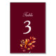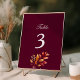 Ajoutez une touche de saison élégante à votre réception avec cette carte de numéro de table mariage de automne. Doté d'un riche arrière - plan bordeaux et de feuilles d'automne aux aquarelles vibrantes, ce design est parfait pour des mariages rustiques ou élégants en septembre, octobre ou novembre. La numérotation audacieuse et la typographie classique rendent les sièges faciles et beaux.