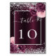 Un profond arrière - plan à dégradé bordeaux, décoré de parties scintillant faux argenté, pétille et de fleurs roses et burgudny. Texte blanc. Personnalisez et ajoutez vos numéros de table. Ajoutez vos numéros un par un.