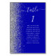 Le bord gauche de cette élégante carte de numéro de table mariage moderne comporte une bordure en faux parties scintillant argenté. Le mot "table" apparaît dans un script d'écriture blanc et fantaisiste sur un arrière - plan bleu royal. Ajoutez les noms de vos invités affectés à chaque table