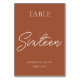 Les numéros de table modernes rehaussent le décor de votre table d'accueil de mariage. Le design comprend une police de script élégante en blanc sur un arrière - plan de couleur terre orange brûlée, parfait pour un mariage de automne ou un banquet. Commandez chaque numéro de table dans la collection ou modifiez cette carte pour chaque numéro nécessaire. Le dessin est imprimé sur les deux côtés.