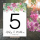 Plage moderne Elégant Palm Floral Mariage Tropical Numéro de table. Avec des accents botaniques roses et verts contrastés par le lettrage noir et blanc. Un design tropical qui embrasse la beauté tranquille de la nature mêlée à un côté ludique qui vous aidera à vous amuser. Un mélange de feuilles tropicaux verdoyants apaisants, dont des feuilles de bananes, des palmiers, des feuilles de monstères et des plantes de princesse roses, ainsi que des fleurs apaisantes d'orchidées rose violet et des fleurs de protéa, entrelacées avec divers autres feuillages. Améliorée par une police de typographie manuscrite ou de script moderne, cette impression enchanteresse rayonne de charme et de sophistication. Ce design polyvalent apporte un sens du paradis tropical à tout cadre ou occasion spéciale, le rendant parfait pour un mariage de destination, ou juste quand vous voulez ajouter une flamme tropicale.