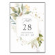 Cartes de numéro de table de mariage floral à l'aquarelle dans des tons pastel avec un cadre géométrique doré personnalisable selon les spécificités de votre événement.