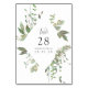 Cartes de numéro de table de mariage inspirées de la verdure organique avec un cadre géométrique conçu pour être personnalisées rapidement et facilement selon les spécificités de votre événement.