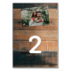 Ce design comprend un arrière - plan rustique en planches de bois avec 2 photos de couple. L'arrière - plan en bois marron rustique est complété par le texte blanc et votre photo personnelle qui est affiché comme fixé sur l'arrière - plan en bois avec des boulons rouillés rustiques. Les tons marrons du grain de bois créent une grange rustique comme un jardin. Design élégant de numéro de table de mariage avec des éléments modernes. Des invitations de mariage et d'autres articles de papeterie sont également disponibles. Customisez le numéro et achetez chaque numéro de table individuellement en fonction du nombre de numéros de table dont vous avez besoin.