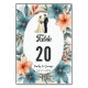 Ce numéro de table de mariage élégant à l'aquarelle florale est parfait pour un mariage moderne. Le design romantique présente un cadre floral élégant à l'aquarelle avec une illustration de la mariée et du marié et une calligraphie noire sur fond blanc.