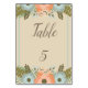 Parfait pour les tropiques chaudes, ce panneau de table présente un beau fond beige avec les informations écrites en brun chaud. la bordure est bleu clair avec de belles illustrations florales bleues, pêche et vertes.