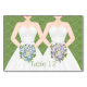 Mme et Mme deux mariées en robes mariages tenant des bouquets fleuris - cartes de table Mariages gai / fierté lesbienne mariage / cérémonie civile cartes de réglage. design gay mariage placements de Ricaso original artwork©delightful-doodles.com