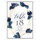 Carte de numéro de table de mariage | Un feuillage feuille moderne bleu indigo profond entoure un cadre doré à facettes multiples - des étincelles brillent sur les feuilles et un revers bleu indigo profond. Une combinaison de calligraphie à l'écriture moderne associée à une mise en page de texte minimaliste et contemporaine en fait une suite de mariage au style tendance. Conception créée pour TheBarefootBride™ par © WhimsicalArtwork™. Cela fait partie d'une collection de suites de papeterie de mariage avec des accessoires de mariage assortis ainsi que de la papeterie pour baby shower et autres occasions. N'hésitez pas à nous contacter si vous avez besoin d'aide.