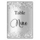 Le numéro de table est écrit avec un style manuscrit élégant. Lettres noires, fond blanc sur le devant et fond argent faux avec poussière de paillettes fausses, scintille sur le dos.