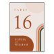 Nombres de table de mariage bohème moderne avec des formes d'arc en terracotta, rouille, orange brûlé et tons émeraude foncé.