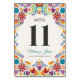 This Nuestra Boda Flowers Botanical Spanish Wedding Table Number design showcases a rich and vibrant floral arrangement around the edges, with bold colors like red, orange, blue, purple, and yellow that create a festive and welcoming feel. The flowers are intricately combined with leafy patterns and small, detailed embellishments, giving the design a lively and textured look. The balance of bright, contrasting colors and the delicate, symmetrical arrangement make this an eye-catching option for a celebratory wedding stationery, especially one with a traditional or folkloric theme.