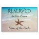 La réception de mariage a réservé des cartes de sièges sur le thème de la plage. Belle eau eau bleue de l'océan avec des vagues qui tapissent le rivage, est l'image derrière le texte noir, personnalisé. Customisez les trois lignes, avec le texte "réservé" en haut, nommez en bas, et le titre en bas. Réservez des sièges pour les membres de la fête de mariage et les membres spéciaux de la famille avec ces cartes.