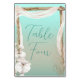 Ce numéro de table mariage a un thème romantique sur la plage. L'arrière - plan bénéficie d'un dégradé qui ressemble à une plage ou une île tropicale de l'océan. Au centre se trouve une arche boho en bois et en mousselon. Une grande tige d'orchidées blanches de style aquarelle est placée sur la gauche.