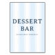 Ce panneau de table de mariage présente un design épuré et minimaliste avec des bandes verticales de teintes bleues douces, créant une atmosphère apaisante et accueillante. La police serif gras pour "DESSERT BAR" est complétée par un message amical sans empattement en dessous, encourageant les invités à se régaler librement. La mise en page simple met en valeur la clarté et l'élégance, ce qui la rend parfaite pour guider les invités vers les douceurs de votre événement. Son style moderne et sa palette de couleurs apaisantes ajoutent une touche de sophistication tout en maintenant une ambiance décontractée idéale pour n'importe quelle station de desserts.