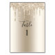 Cartes mariage Numéro de table avec parties scintillant à goutte couleur Champagne. Disponible en deux papiers.